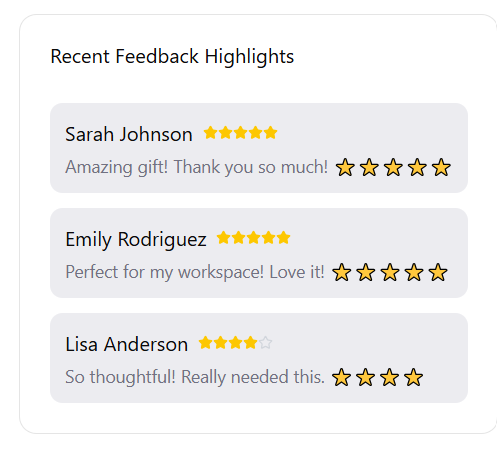 At Cherishify, we believe that thoughtful gifting can transform employee satisfaction and strengthen team spirit. Our platform is designed to make corporate gifting effortless, impactful, and truly appreciated. Here, you can see how your employees’ feedback could look in our gifting tool.